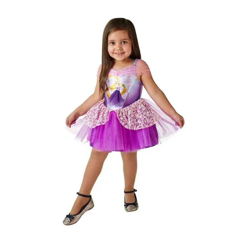 A soft lavender and pink dress inspired by Rapunzel, featuring puffed sleeves, crisscross ribbon detail, and sparkly accents. Made for toddler princesses to twirl and play in royal style.