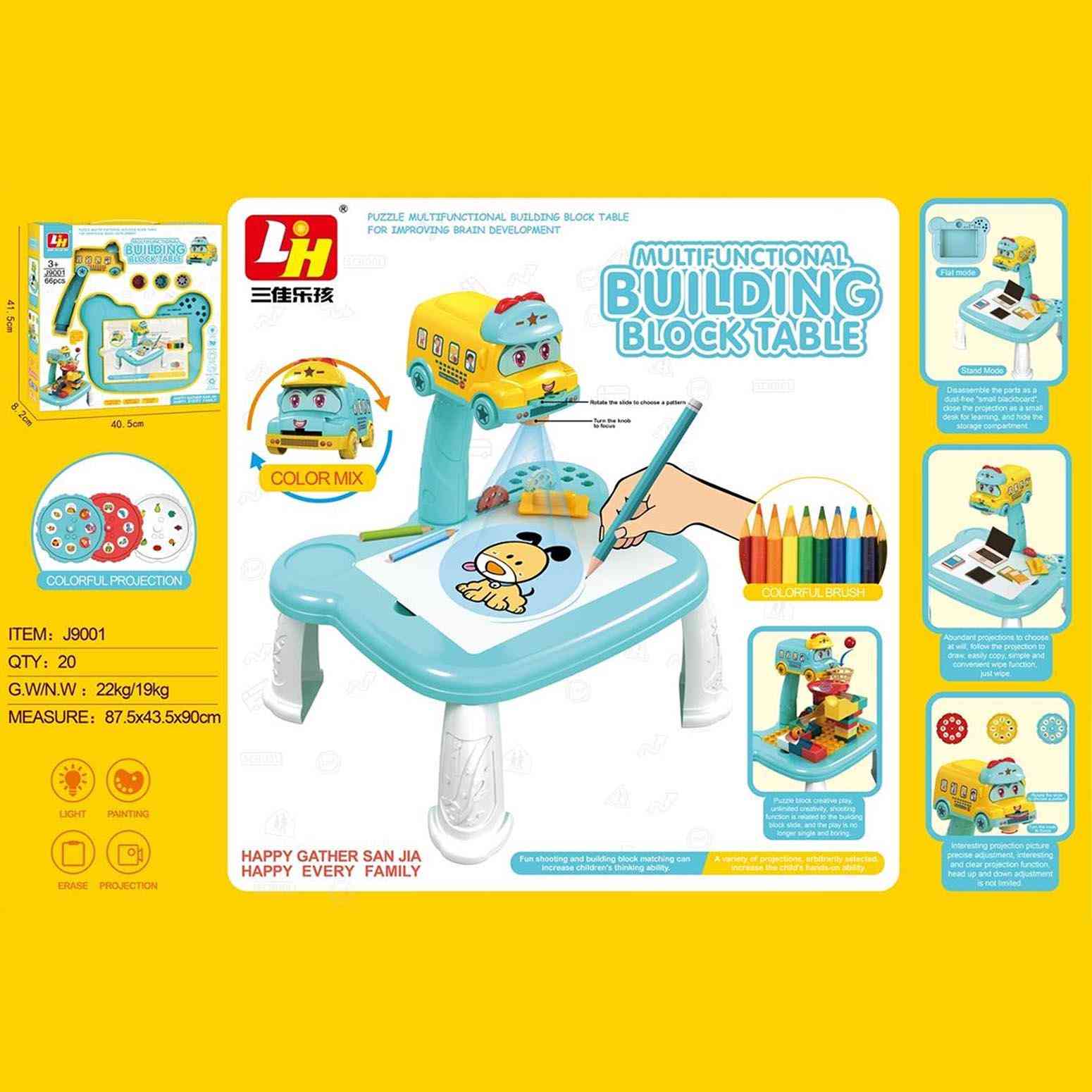Featuring a cute school-bus projector with rotating slides, kids can project images onto the table and trace them easily, helping develop fine motor skills, hand-eye coordination, and early drawing confidence. The table also includes building block pieces for construction play, a mini basketball shooting game, and storage areas for accessories.