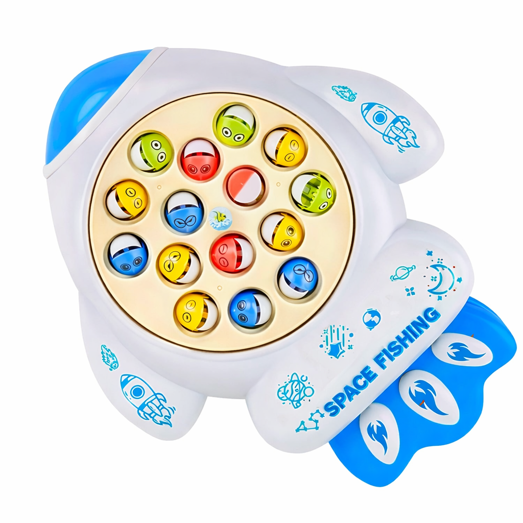 Blast off into fun with the Space Rocket Fishing Game! This exciting space-themed fishing game features a rotating rocket design with colorful fish that open and close their mouths. Kids use the fishing rod to catch the fish as the game plays music, creating a fun and engaging challenge. It helps develop hand-eye coordination, focus, and reaction speed while keeping children entertained through interactive play. Perfect for solo or group play.