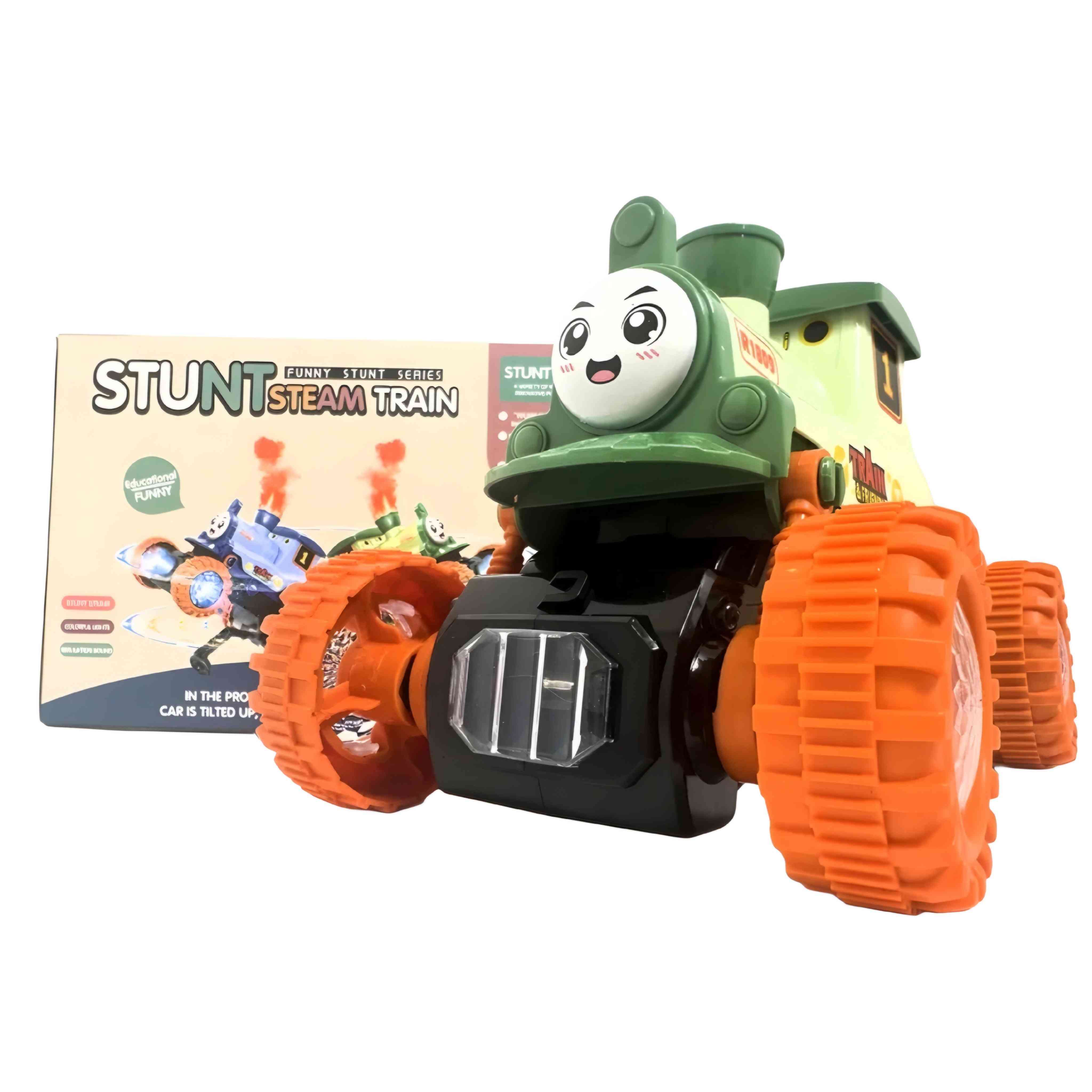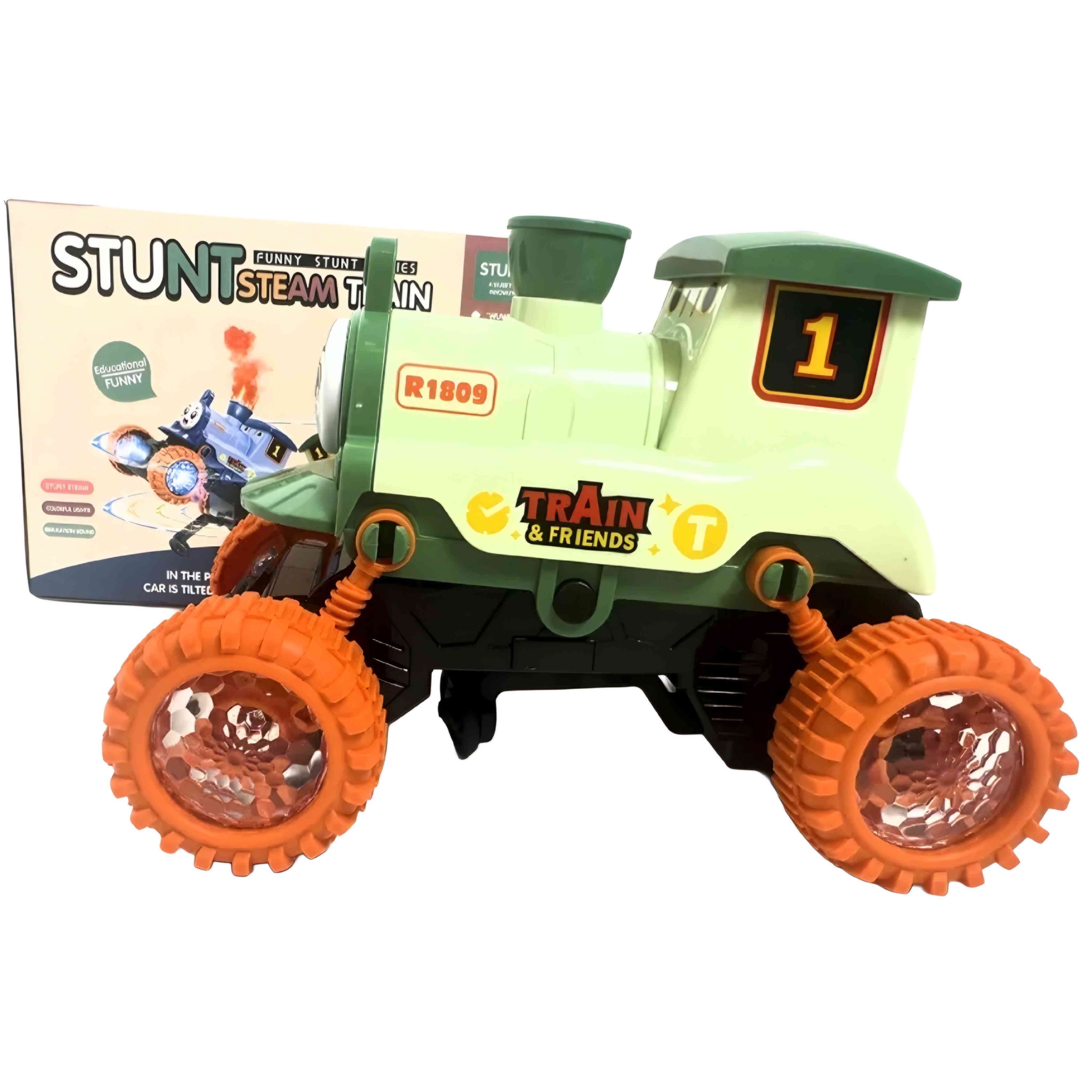 Steamy stunts and chugging fun—train rolls, spins, and performs tricks.