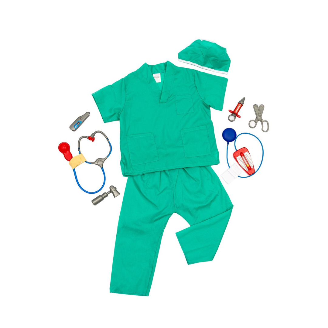 A surgeon's costume is made up of several essential elements. It generally includes a pair of surgical gowns, usually blue or green in color, appropriate , a cap, and a mask.