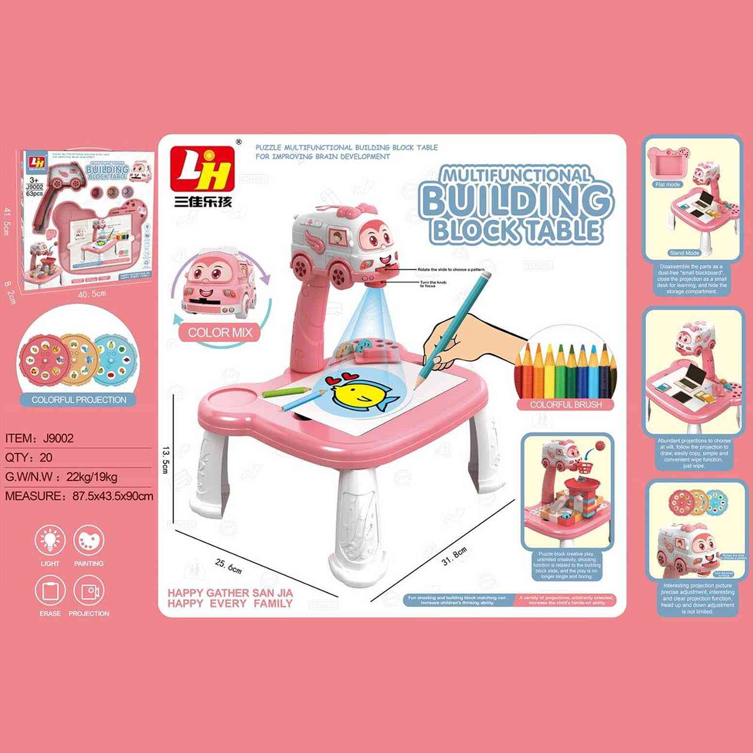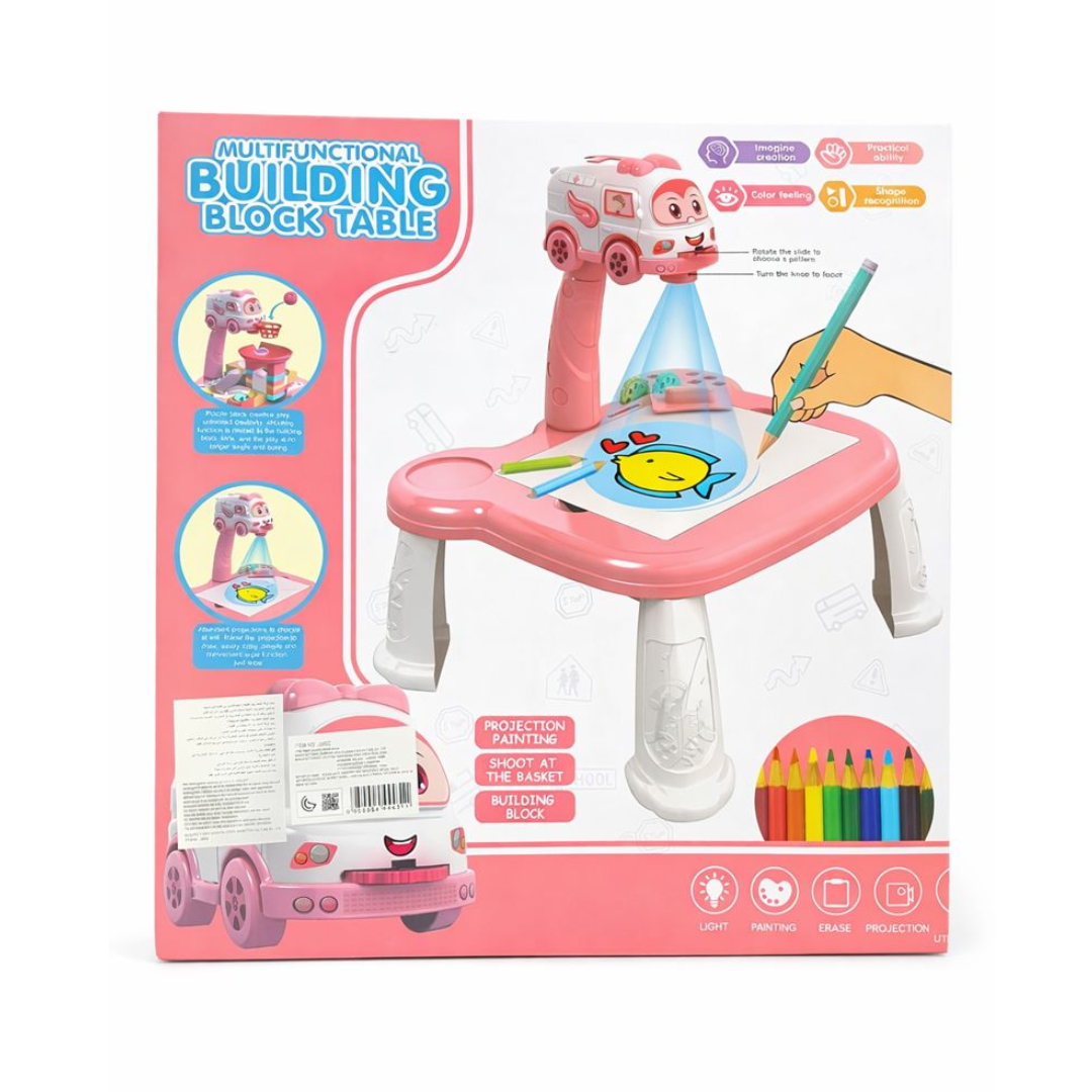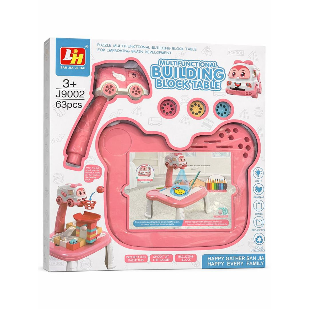 The Sweet Builder Pink Activity Desk & Blocks Set is a fun and educational multi-functional play table designed to spark creativity and develop essential skills in young children. It features a cute projector car that displays images for tracing and coloring, a building block area for construction play, and a mini basketball shooting game for active fun.