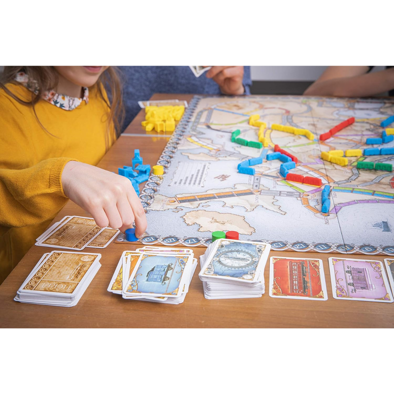 Ticket to Ride: Europe is a popular board game of cross-country train adventures. In the game, players collect cards depicting different types of train cars, which they use to claim railway lines that connect cities across Europe. The goal is to complete routes and score points, creating a fun and engaging gaming experience for players. The game is available in both Arabic and English.